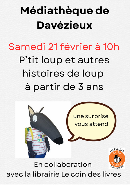 Un temps d’histoires sur la thématique du loup, dès 3 ans en collaboration avec la librairie le coin des livres.